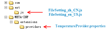 Compile TemperatureProvider.properties, FileSetting.js together with the implementation class to generate a Jar package, the structure of which is shown as below:
