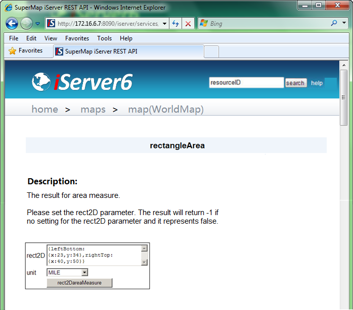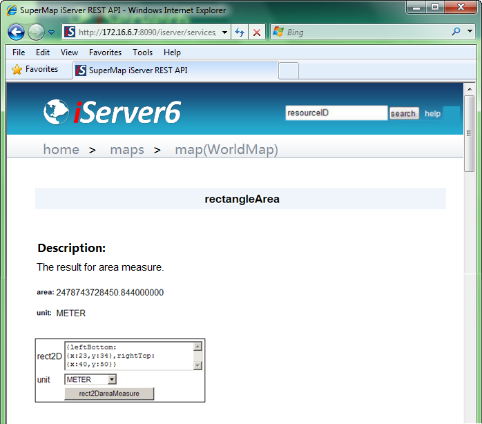 Up till now, an extended resource is finished. The rectangleArea resource implements the area measurement of a rectangular area on a map. Start the service and use the URI below http://localhost:8090/iserver/services/components-rest/rest/maps/WorldMap/rectangleArea.html, taking the HTML output format as an example, to access the rectangleArea resource of the WorldMap, as shown below.