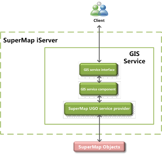 The implementation of SuperMap iServer is divided into three layers: service providers, service components and service interfaces. The service component uses the GIS services provided by service providers, and the GIS functions of the service component can be published in the form of specified service interfaces. This hierarchy structure is good for the encapsulation of the GIS functions to implement aggregation, clustering. Therefore, GIS functions can be published as various types of services conveniently.