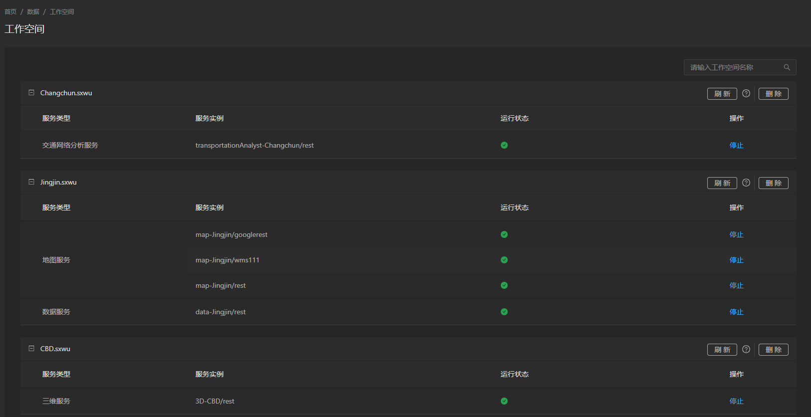 The workspace page lists detailed information about all current workspaces, including the service type, service instance, and service running status that each workspace has been published as. As shown in the figure below, users can control the running status of individual services through the control buttons in the operation column, or delete workspaces through the "delete" button. If a workspace is deleted, all service instances it was published as will be deleted. Click the "Refresh" button to refresh all data sources in the workspace, which is used to synchronize the addition, deletion, and modification of datasets and fields. You can also quickly search by entering the name of your workspace through the search box in the upper right corner.