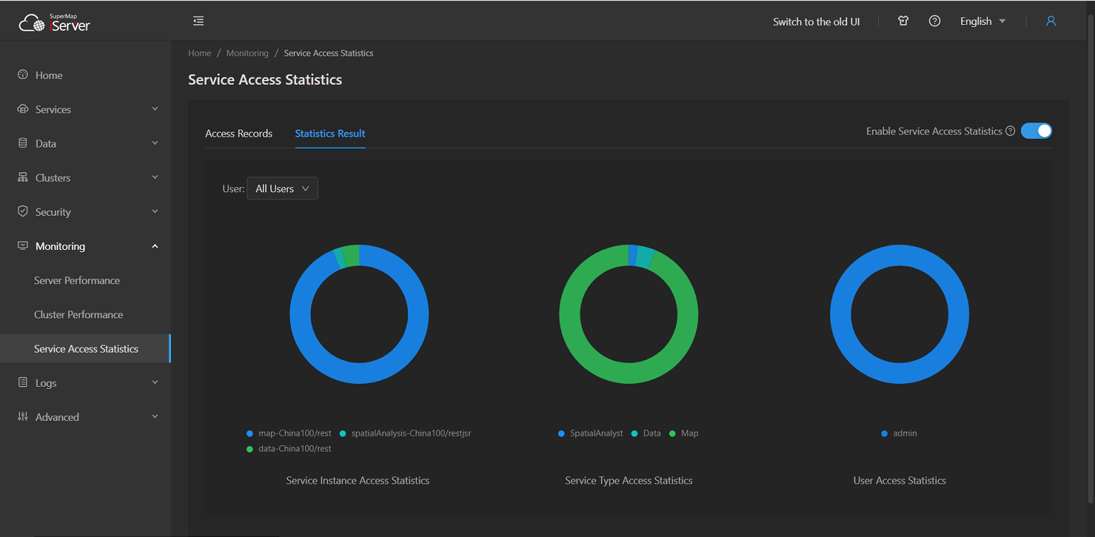 SuperMap iServer provides the service access statistics functionality, which is used to check the statistical information of the service access record and the user access record in a period.