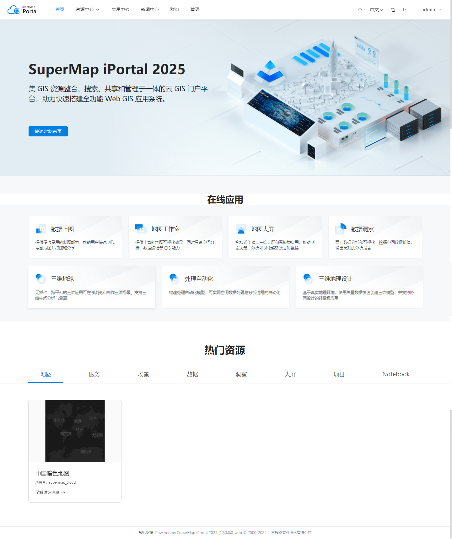 - 内容(body):页面内容的主体区。首页内容区支持添加横幅、快捷链接、资源卡片、地图、内联框架等 13 种组件。这些组件支持以拖拽或单击的方式添加到编辑区,且组件采用了行布局。添加到编辑区的组件支持编辑组件属性和所在行的设置。详见本节布局和组件的介绍。