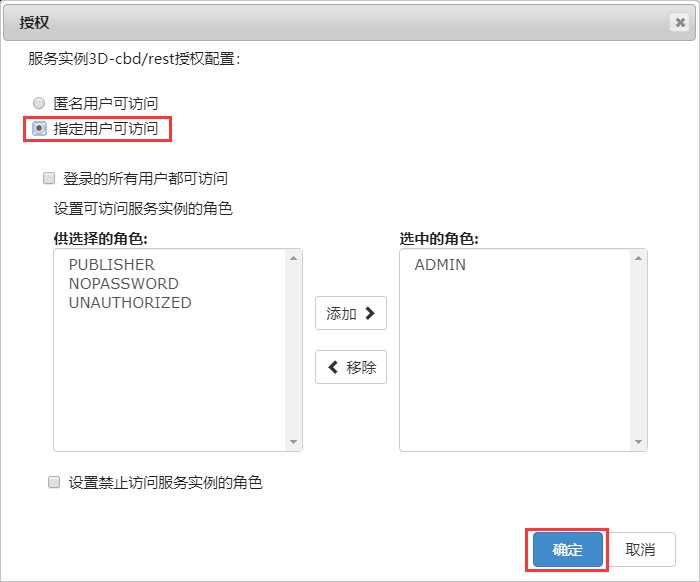 (2).点击图标后出现一个弹窗,默认选中匿名用户可访问,点击“指定用户可访问”,出现以下选项,根据需要添加角色, 点击“确定”,便为服务设置了权限。